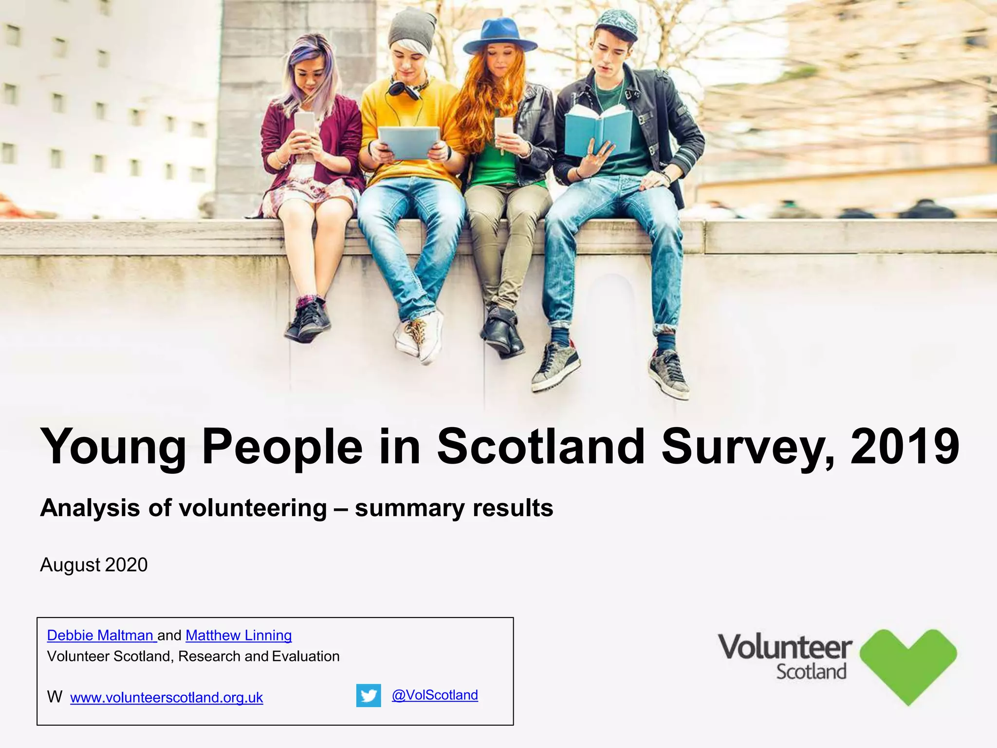 The document summarizes survey results on youth volunteering in Scotland from 2019. It finds that 49% of youth participated in formal volunteering, providing 11 million hours annually, compared to 26% of adults. However, youth volunteered less frequently and intensely than adults. Informal volunteering rates were lower at 25% for youth versus 36% for adults. Parental encouragement was an important influence on youth volunteering participation. The benefits of volunteering for youth well-being were emphasized, in addition to career benefits.