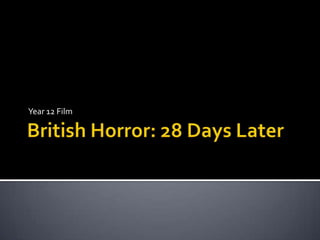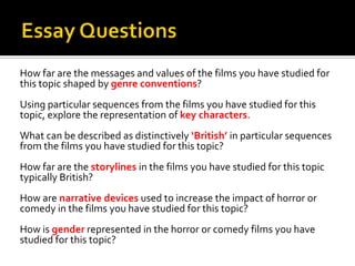 The document contains questions about representing key characters, gender, and narrative devices in horror and comedy films. It discusses how characters like Jim, Selena, and Major Henry West are represented in the films and undergo various transformations. Gender is often represented through portraying women as victims of male killers or as sexual objects. Narrative devices common in horror genres are used to increase horror's impact and communicate the story in recognizable ways to audiences.