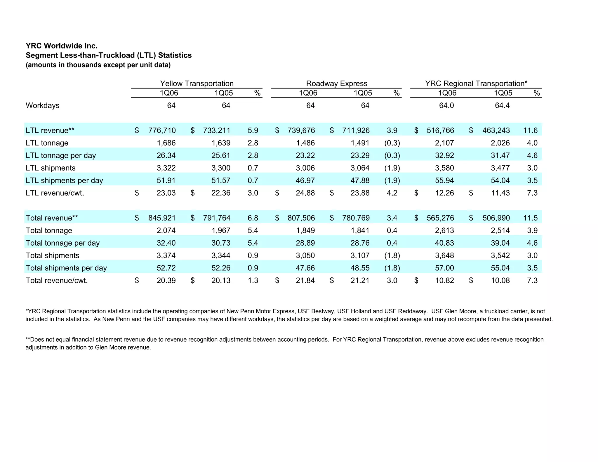YRC Worldwide Inc. reported segment statistics for its less-than-truckload (LTL) operations for the first quarter of 2006 compared to 2005. Yellow Transportation saw increases in LTL revenue of 5.9% and tonnage of 2.8% with minor increases in shipments. Roadway Express reported increases in LTL revenue of 3.9% with a slight decrease in tonnage. YRC Regional Transportation experienced the largest increases with LTL revenue up 11.6% and tonnage and shipments both increasing over 4%.