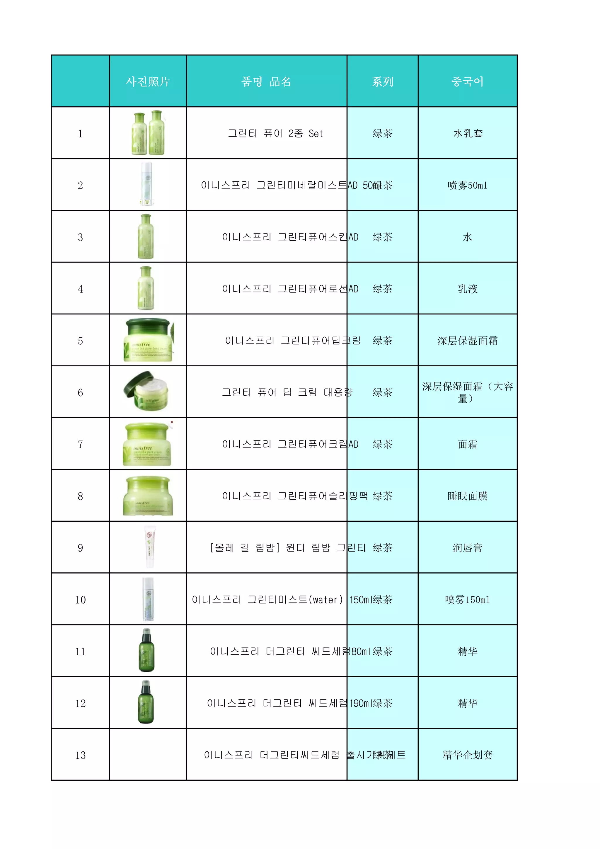 스트레치 마스크面膜 美白 253 안티링클 스트레치 마스크 面膜 腊菊抗皱 254 이니스프리 브라이트닝스크럽팩 (레몬그라스)面膜 柠檬去角质 255 이니스프리 샤이닝마스크 (7허브) 面膜 7种草本亮肤 256 이니스프리 리페어마스크 (에버래스팅)面膜 腊菊修复 257 이니스프리 모이스처 슬리핑마스크팩(라벤더)面膜 薰衣草保湿睡眠 258 이니스프리 워터인마스크 (올리브)面膜 橄榄补水 259 이니스프리 오투포어마스크팩 面膜 O₂毛孔收缩面膜 260 이니스프리 내추럴데오도란트스프레이 플로랄 50ML 261 이니스프리 내추럴데오도란트스프레이 마일드 50ML 262 이니스프리 오션스프레시브리즈 핸드크림 263 이니스프리 스위트터치오브조이 핸드크림 264 시즌스 오브 그린티 핸드크림 265 이니스프리 쿨링 풋 미스트