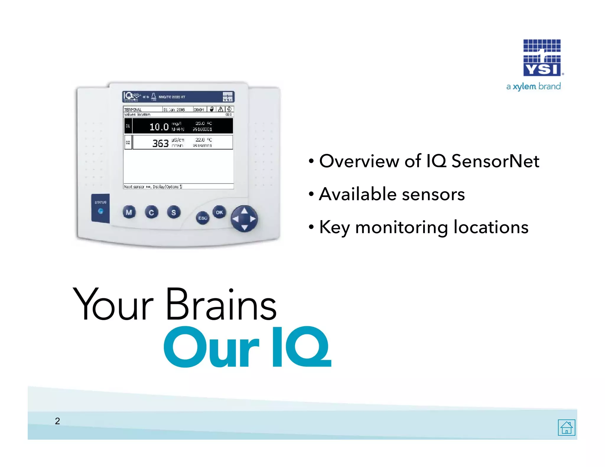 The document presents an overview of the IQ Sensornet continuous process monitoring and control instrumentation, highlighting the features and components of the 2020 XT controller system. It details the capabilities of various sensors, communication interfaces, and maintenance-free functionalities, emphasizing the importance of accurate measurements in wastewater management. The presentation also outlines typical installations, applications, and YSI's commitment to supporting water professionals.