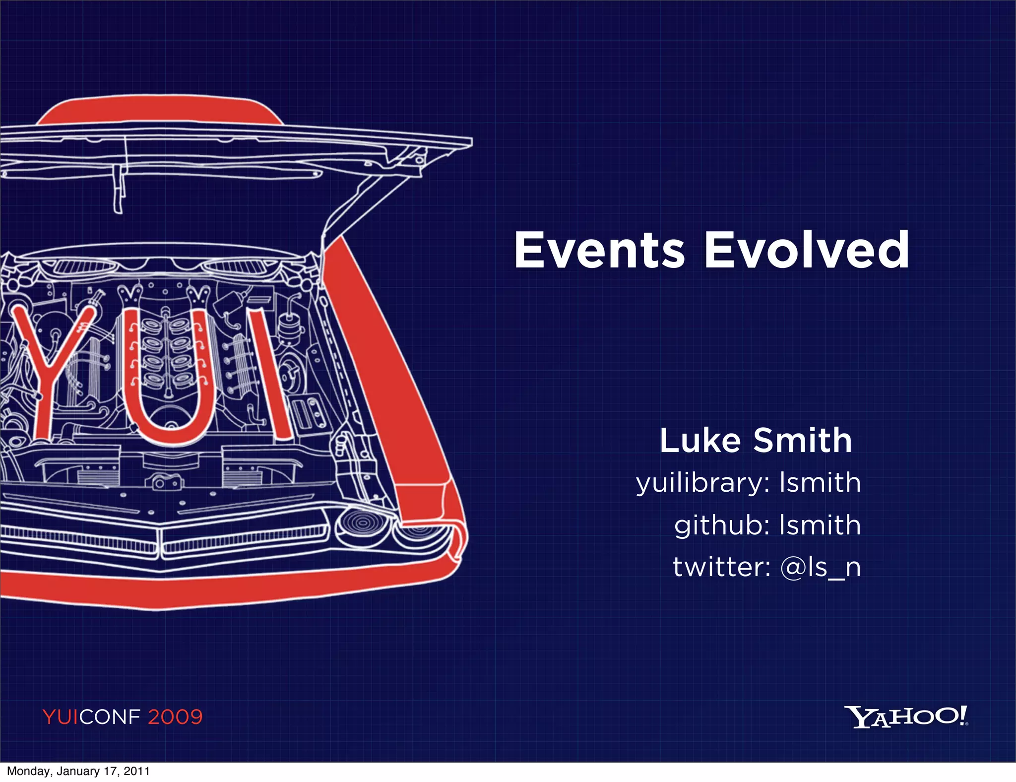 The document discusses the evolution of event handling in JavaScript libraries like YUI. It shows how early approaches involved multiple ways of attaching event handlers and a lack of normalization. YUI 2 introduced a normalized subscription model but event handling was not fully normalized. YUI 3 further improved on this with a fully normalized subscription and event handling model using DOM-like syntax and contexts. It also discusses how YUI 3 extended this model to custom events, introducing features like default behaviors, payloads and control over bubbling to make custom events behave more like DOM events.