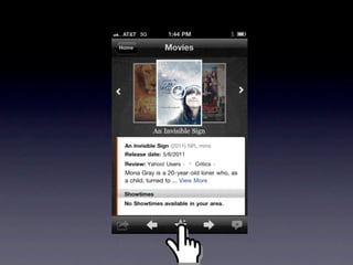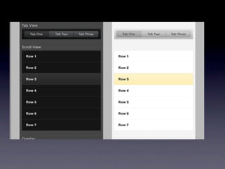 2. It describes the core features and modules of YUI that are useful for mobile development, including loading modules, transitions, gestures, scrolling and more.