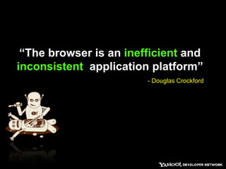 This document introduces the Yahoo! User Interface (YUI) library and highlights its key features and advantages for web development. YUI 3 aims to make development lighter, faster and easier by providing a consistent API, optimized code, and the ability to load only required modules. It helps address inconsistencies in the browser environment and makes tasks like DOM manipulation, event handling and data fetching simpler. The library is open source and supported by a large community and gallery of additional components. Developers are encouraged to use YUI to focus on their ideas rather than browser quirks.