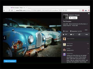 The document discusses the web platform 'modown' and its focus on creating single-page applications (SPAs) with a foundation in Node.js and Express. It highlights various components and examples related to the use of modown and express-yui for building SPAs, emphasizing modular development without constraining developers to specific frameworks. Additionally, it mentions major customers like Flickr, and differentiates modown as a principle rather than a formal product or framework.
