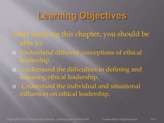This chapter discusses ethical, servant, spiritual, and authentic leadership. It aims to help readers understand different conceptions of ethical leadership, the difficulties in defining and assessing it, and the individual and situational influences. The chapter also examines theories of transforming, servant, spiritual, and authentic leadership, and the consequences of ethical leadership for followers and organizations. Finally, it explores ways to promote ethical behavior and oppose unethical practices.