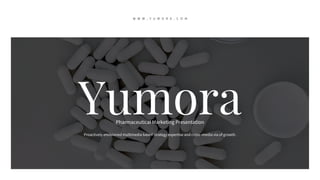 The document presents a comprehensive overview of Yumora's pharmaceutical marketing strategies, emphasizing proactive and multimedia-based approaches for growth across various markets. It highlights the importance of collaboration, standards in web-readiness, and effective testing methods for medications while providing pricing information for various service packages. The emphasis is on empowering healthcare practitioners and enhancing patient care through innovative marketing practices.