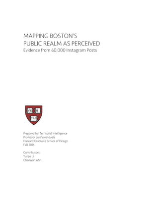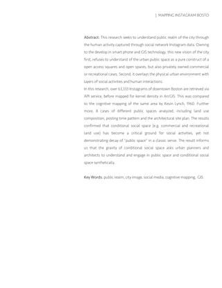 This document analyzes over 63,000 Instagram posts in downtown Boston to understand how social media data can provide insights into public space usage. Key findings include that conditional public spaces like commercial areas see more social activity than traditional public spaces. Peak posting times and seasonal fluctuations also varied between different land use types. The research examines 9 case study areas in more depth to understand posting densities, time patterns, and the relationship between social media usage and physical space characteristics.