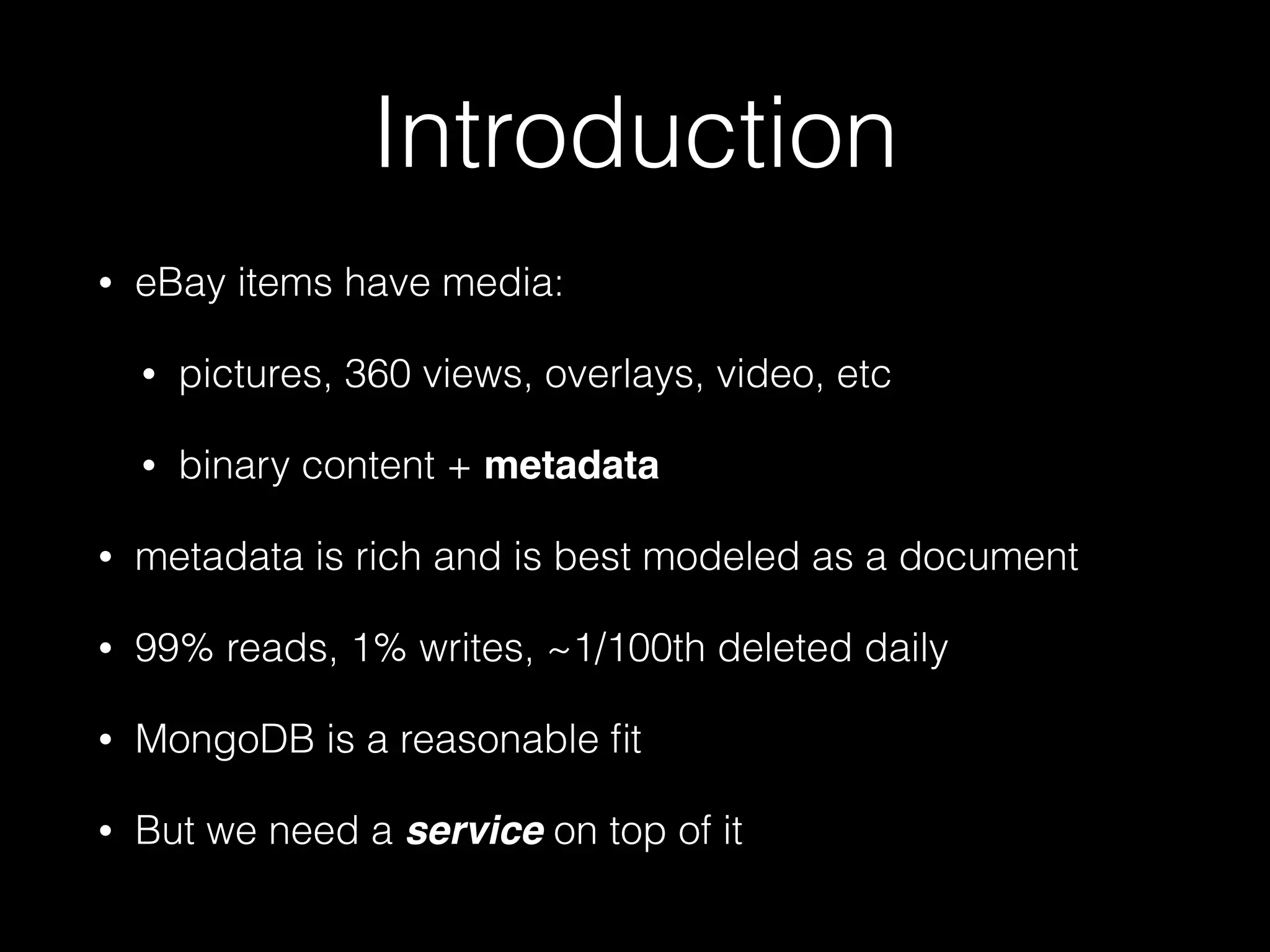 The document outlines the design of an elastic metadata store for eBay's media platform, detailing the necessity of a data service layered on top of MongoDB to manage a predominantly read-driven workload with minimal downtime. It introduces a bucket-based architecture to enhance scalability, data lifecycle management, and efficiency during operations such as compaction and data migration. The approach includes a service tier that manages connections and workflow automation for bucket operations, aiming for seamless operation and robustness in managing data across multiple tenants.