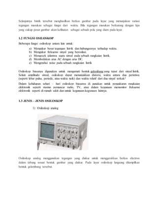 Osiloskop adalah alat ukur elektronika yang berfungsi memproyeksikan bentuk sinyal listrik agar dapat dilihat dan dipelajari. Osiloskop terdiri dari dua jenis utama, yaitu osiloskop analog dan digital. Osiloskop digunakan untuk mengamati bentuk gelombang sinyal listrik dan menunjukkan distorsi serta waktu antar dua peristiwa.