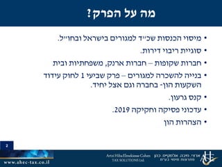 בישראל למגורים ד"ל. •דירות ריבוי סוגיית. •שקופות חברות–ארנק חברות,ובית משפחתיות •למגורים להשכרה בנייה–שביעי פרק1עידוד לחוק הון השקעות-יחיד אצל וגם בחברה. •גרעון קנס. •וחקיקה פסיקה עדכוני2019. •הון הצהרות 2 הפרק על מה?