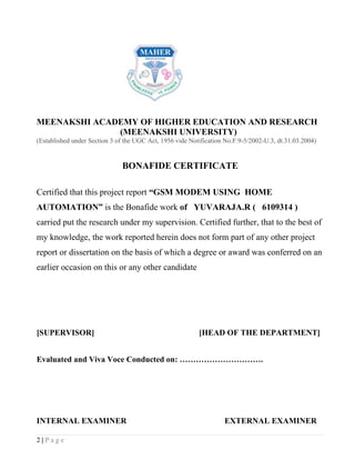 The document describes a project report on a GSM modem home automation system. The system uses a GSM modem to receive SMS commands and control home appliances like lights and fans remotely. It consists of components like a microcontroller, GSM modem, MAX232 circuit, relays, LCD display. The microcontroller receives SMS via the GSM modem and controls the appliances based on the commands. The system allows remote monitoring and control of home devices through SMS from anywhere with GSM network coverage.