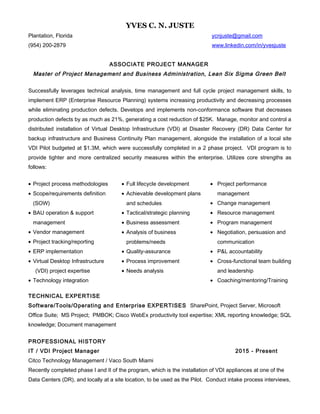 Yves C. N. Juste has over 10 years of experience in project management, business analysis, and information technology. He holds a Master's in Project Management and an MBA. Currently he is an Associate Project Manager at Citco Technology Management, where he is managing a $4.4 million Virtual Desktop Infrastructure program rollout across multiple sites. Previously he has managed implementations of ERP systems, increasing productivity and reducing defects. He utilizes strengths in project methodologies, requirements definition, operations management, and more.