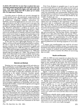 The study assessed the effectiveness of cupric hydroxide and floating row covers in managing bacterial fruit blotch and insect pests in watermelon and zucchini crops. Treatments with cupric hydroxide significantly reduced fruit blotch symptoms and improved yields, while floating row covers effectively excluded insect pests and virus transmission, leading to higher marketable fruit yields. However, excessive applications of cupric hydroxide caused plant stunting and phytotoxicity, necessitating further research on optimal application timings.