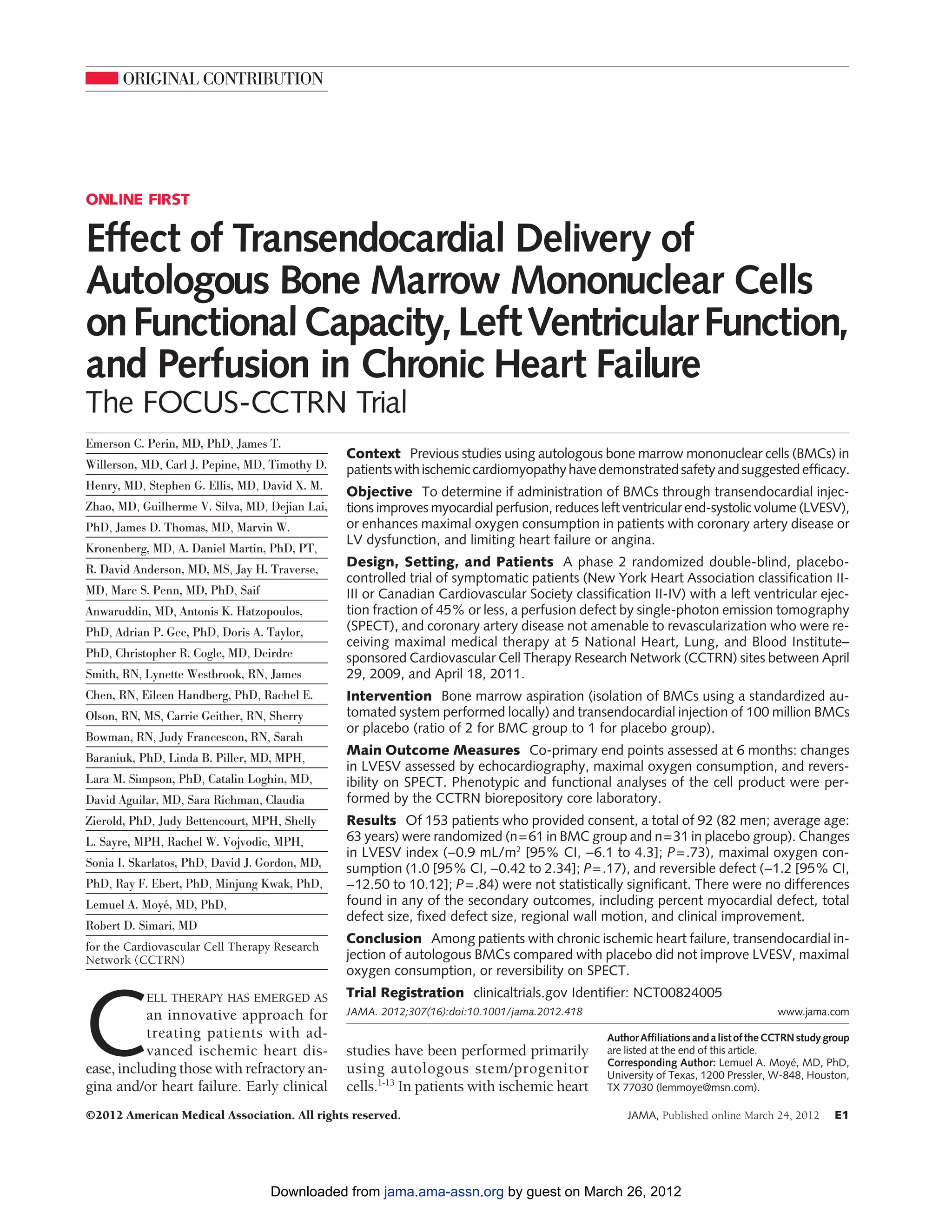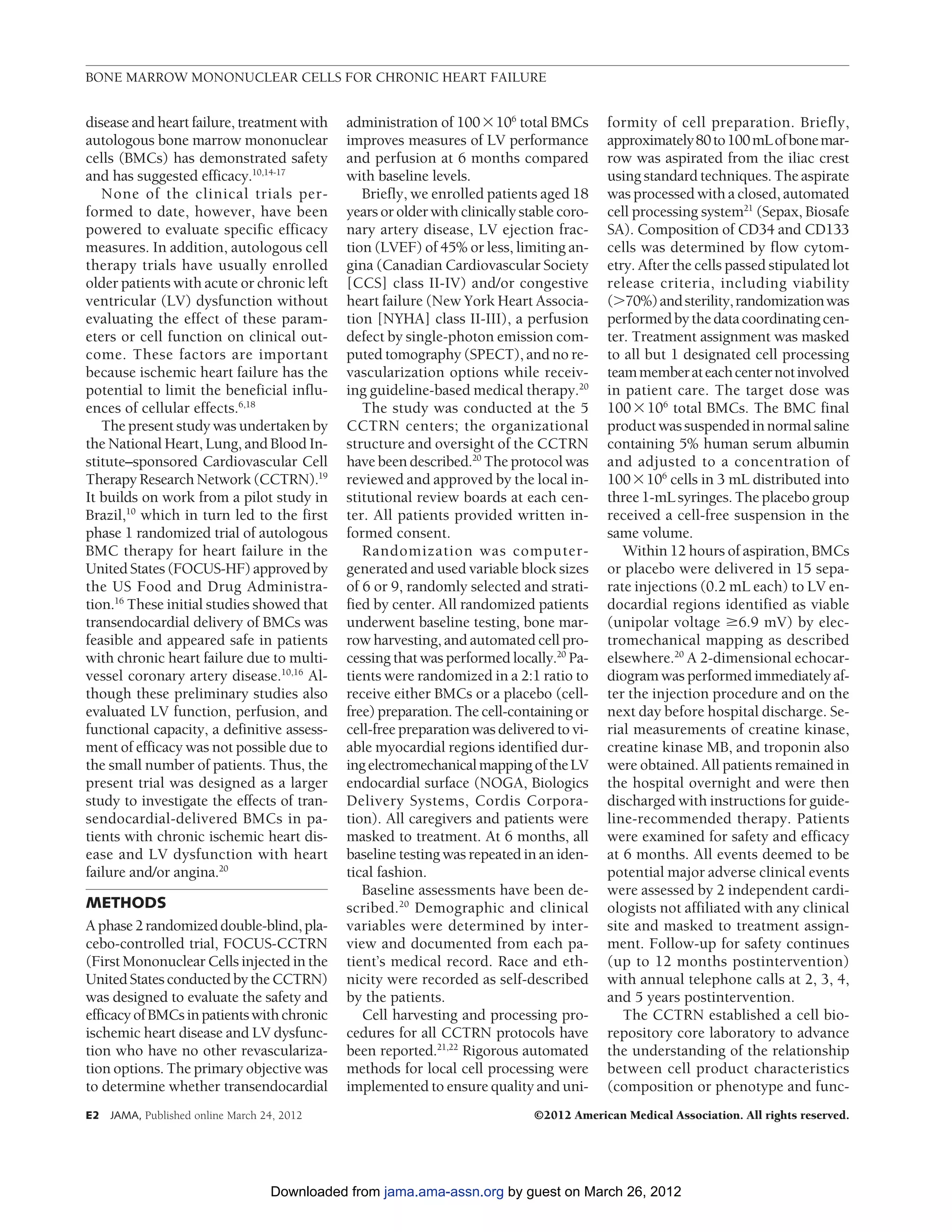 This randomized, double-blind, placebo-controlled trial evaluated the effects of transendocardial delivery of autologous bone marrow mononuclear cells (BMCs) in 92 patients with chronic heart failure. The primary objectives were to determine if BMC administration improved left ventricular end-systolic volume (LVESV), maximal oxygen consumption, or reversibility of perfusion defects on single-photon emission computed tomography (SPECT) compared to placebo at 6 months. Results showed no statistically significant differences between the BMC and placebo groups in changes in LVESV, maximal oxygen consumption, or reversible defect size by SPECT. There were also no differences in any secondary outcomes, including echocardiographic or clinical measures. Thus, tran