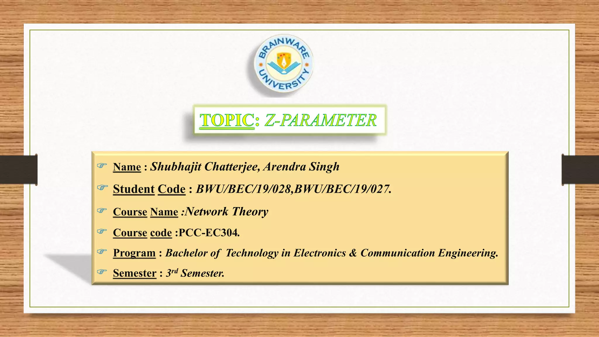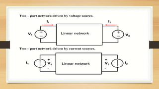 This document discusses two-port networks and Z-parameters. It defines a two-port network as an electrical network with two ports for input and output. The document explains that Z-parameters relate the terminal voltages and currents, where z11 is the input impedance, z12 is the transfer impedance from port 1 to port 2, z21 is the transfer impedance from port 2 to port 1, and z22 is the output impedance. An example circuit is then used to calculate the Z-parameters of the network by setting the ports to open circuit conditions.