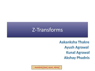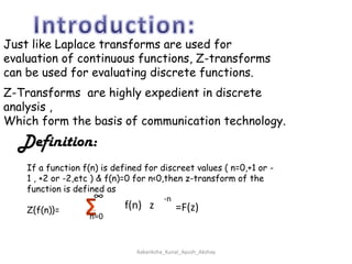 Z-transforms can be used to evaluate discrete functions, similar to how Laplace transforms are used for continuous functions. The z-transform of a discrete function f(n) is defined as the sum of f(n) multiplied by z to the power of -n, from n=0 to infinity. Some standard z-transform results include formulas for exponential, sinusoidal, and polynomial functions. Z-transforms have properties of linearity and shifting, and can be used to solve differential equations with constant coefficients and in applications of signal processing.