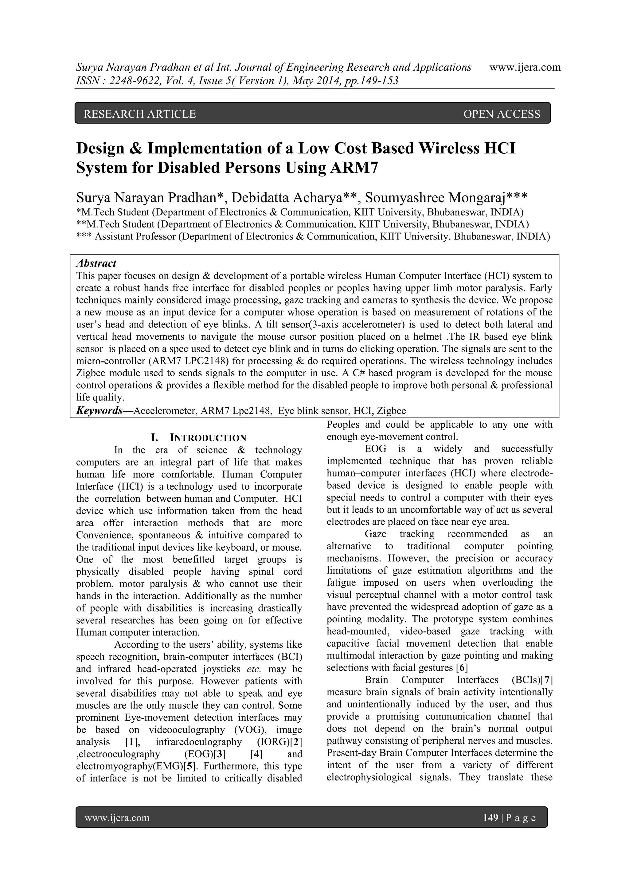 This paper presents the design and implementation of a low-cost wireless human-computer interface (HCI) system for disabled individuals, utilizing head movements and eye blinks for navigation and interaction. The system consists of a tilt sensor to detect head movements and an eye blink sensor to facilitate clicking, both transmitting data to a microcontroller via Zigbee technology. The proposed solution aims to provide a more intuitive and affordable means of computer interaction for people with upper limb motor paralysis.