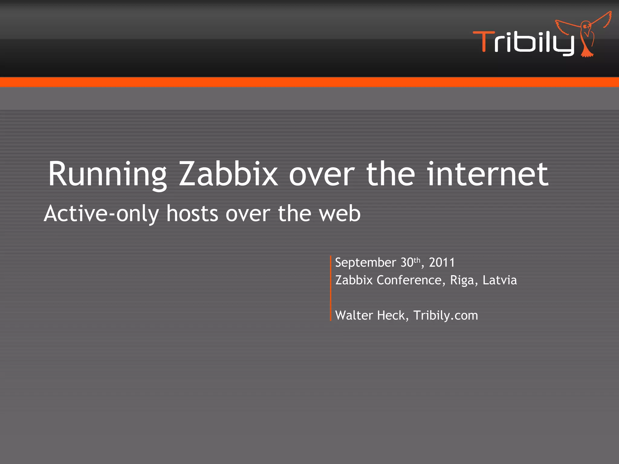 Walter Heck presented on running Zabbix monitoring over the internet for small and medium businesses. Some key challenges included operating with an active-only setup through a single firewall port, developing templates without direct access to customer systems, and worldwide alerting via SMS. The backend used a single Zabbix server with Drupal and MySQL on a dedicated server hosted at Hetzner. Future plans included simplified installation packages and expanding alert methods.