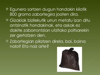 Egunero sortzen dugunhondakin kilotik 800 gramo zabortegira joaten dira. Gizakiak bizilekutik urrun metatu izan ditu antzinatik hondakinak, eta askok ez dakite zaborrontzian utzitako poltsarekin zer gertatzen den. Zabortegian pilatzen direla, bai, baina nola? Eta noiz arte?