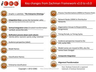The key changes from version 2.0 to 3.0 of the Zachman Framework include: 1) Process flows replacing process transformations and network nodes, 2) Responsibility assignments replacing organization groups, 3) Timing cycles replacing timing periods, 4) The audience perspective moving earlier in the framework, 5) Model names moving and changing, and 6) Additions of composite integration and alignment transformation.