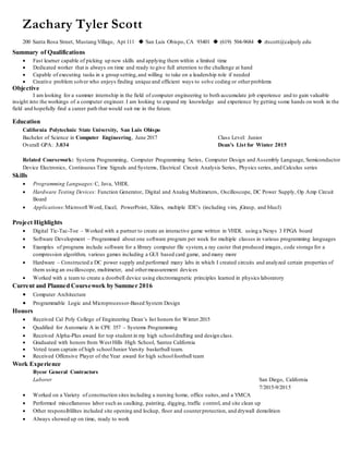 Zachary Tyler Scott is a junior studying computer engineering at Cal Poly with a 3.034 GPA. He is looking for a summer internship to gain hands-on experience in the field and find a potential career path. His skills include programming in C, Java, and VHDL. Notable projects include a digital tic-tac-toe game using an FPGA board and various software programs. He has worked as a laborer for a construction company and is taking computer architecture and programmable logic courses this summer.