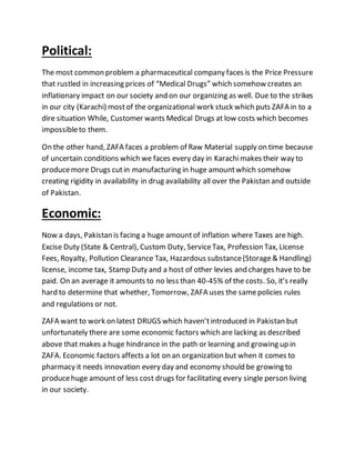 ZAFA Pharmaceutical faces several challenges in Pakistan's political, economic, social, and technological environment: