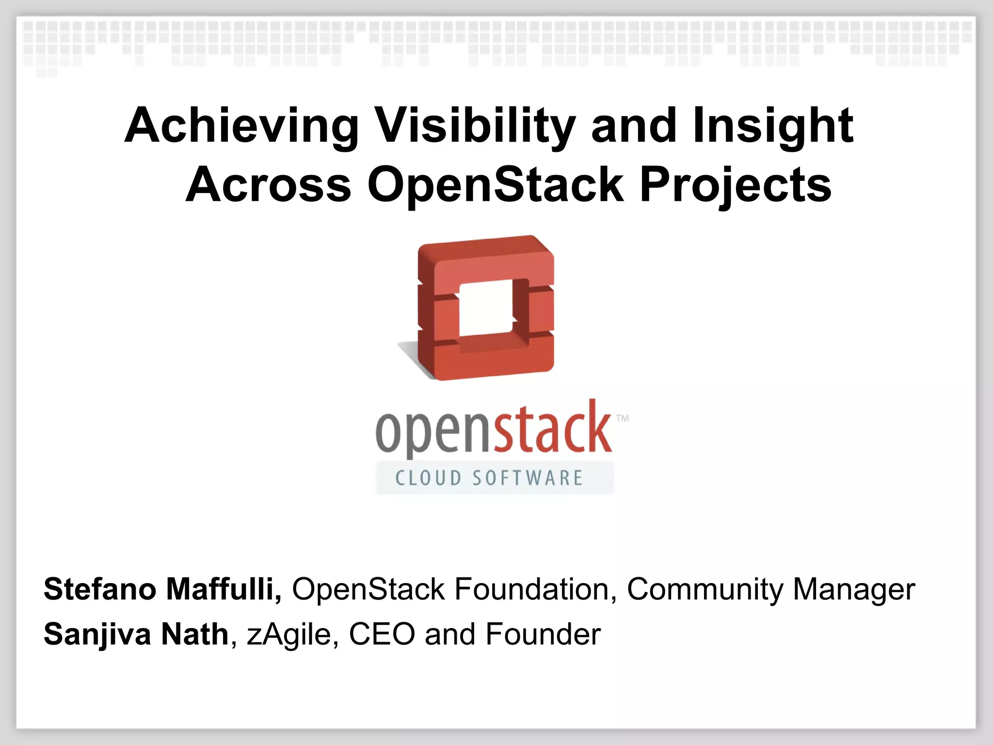 This document summarizes a presentation about achieving visibility and insight across OpenStack projects using an integration pilot powered by Wikidsmart. It discusses current challenges with a lack of integration between project content and silos of information. The Wikidsmart demo shows faceted search and tracing a patch across tools. Next steps proposed include offering a public and private Wikidsmart portal to OpenStack members to bridge internal and community content.