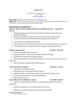 Zahra R Cole has over 5 years of experience in sales, marketing, and event planning. She holds a B.A. in Marketing from Hampton University and is currently a Digital Media Sales and Digital Associate at Response Mine Interactive, where she exceeds monthly goals. Previously, she was a Buyer for Buffalo Exchange and an AT&T Retail Sales Consultant, ranking in the top 5 sales agents in the D.C. region. Cole has also volunteered with the Red Cross and held leadership roles with her church and alumni associations.