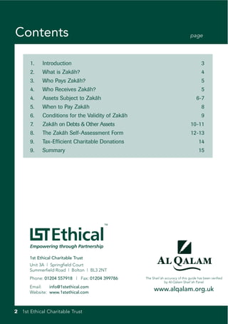 This document provides guidance on understanding and calculating Zakah. It discusses what Zakah is, who pays it and who receives it. Zakah is a compulsory charitable contribution in Islam. It is payable on certain assets above a minimum threshold called Nisab. Those who must pay Zakah are sane adults who possess wealth above the Nisab level. The recipients include the poor, needy, collectors, potential converts, slaves seeking freedom and debtors.