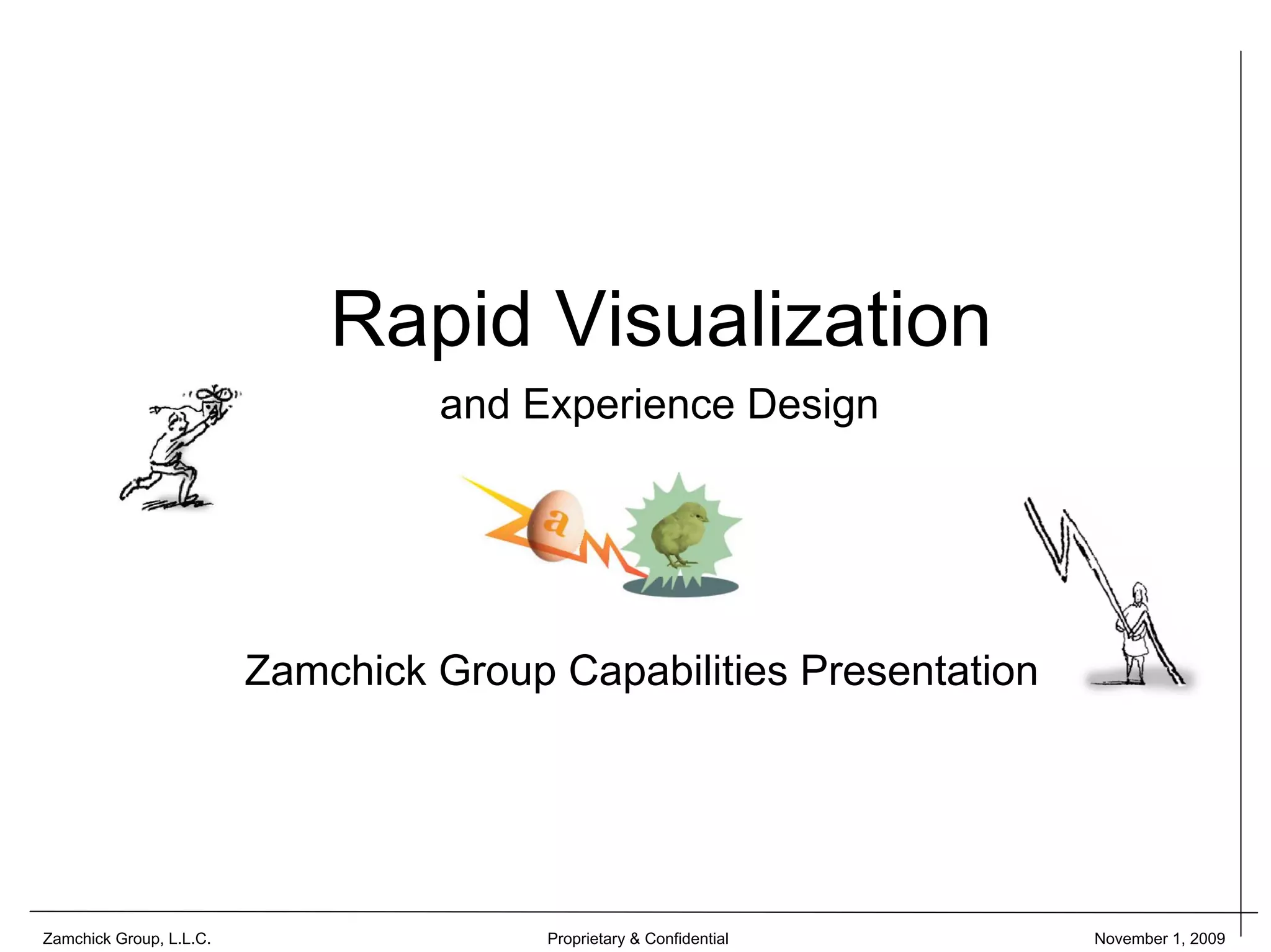 The document summarizes the capabilities of Zamchick Group in rapid visualization and experience design. It discusses how Zamchick Group uses drawings and visualizations to bridge the gap between research and application development. It then lists 9 ways visualization is used, such as translating data into meaningful insights, combining concepts to generate new ideas, and supporting the design process from discovery to product development. Client testimonials praise Zamchick Group's ability to accelerate R&D efforts and push innovative design ideas.