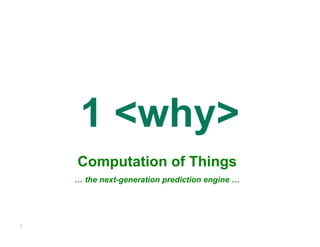 This document discusses the Computation of Things (CoTh), which is described as the next-generation prediction engine. CoTh aims to increase sustainable well-being and happiness through increasing awareness in all aspects of life. It takes an approach based on participatory sensing, assessment of various criteria, intelligent modeling and simulation for sustainability, and producing forecasts and predictions to aid in decision making. CoTh is envisioned as a future personalized virtual advisor.