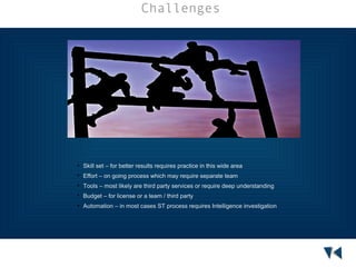 Security testing is a process to determine if an information system protects data and functions as intended, and involves challenges like requiring specialized skills, ongoing effort, tools, budgets, and automation. The Zed Attack Proxy (ZAP) is an easy-to-use tool for finding vulnerabilities in web applications that can be used by developers, testers, and security specialists of all experience levels through both automated and manual scanning. ZAP provides passive and active scanning, reports, integration with CI/CD pipelines, and is open source.
