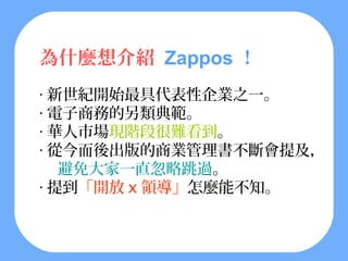 Zappos是一个以客户服务为核心的在线鞋类零售商,通过独特的文化和开放式领导理念促进员工参与。公司在销售和物流上采取创新策略,如365天退货政策和免运费,使顾客体验愉悦,从而建立信任与忠诚。Zappos强调以传递快乐为使命,真正关注客户体验,而非仅仅销售鞋子。