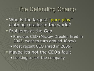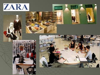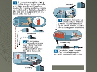 Zara uses IT systems like POS and PDAs to gather real-time customer data on fashion trends. Designers use this data to quickly design and produce new clothing collections, with over 12,000 new items produced each year. Zara's supply chain is highly responsive, allowing new items to go from design to stores in just 15 days. This fast fashion model allows Zara to have minimal inventory and avoid markdowns. In contrast, competitors like Gap rely on long lead times and large production runs, leading to higher risks of unsold inventory.