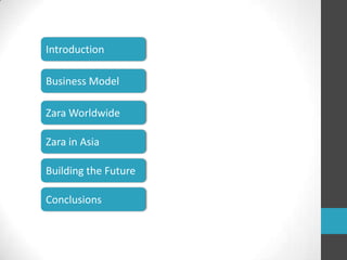 Zara is part of the Inditex Group, one of the world's largest fashion retailers operating over 4,780 stores across 77 countries. Zara pioneered "fast fashion" in the 1980s and has since expanded globally. It focuses on affordable exclusivity through a business model of vertical integration and quick response to fashion trends. Zara aims to expand further in Asia, currently adapting some clothing to local markets. Its future plans include growing online sales and opening more stores, with 50% of new locations in Asia over the next decade.