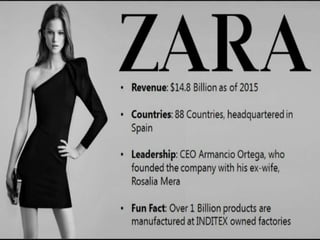 Zara is a successful Spanish clothing and accessories retailer founded in 1975, known for providing high-fashion styles at reasonable prices without relying on traditional advertising. The company utilizes a robust business model focused on vertical integration, in-house production, and rapid distribution, allowing it to quickly respond to changing customer needs. With a presence in 93 countries and a commitment to customer feedback, Zara continues to innovate in the retail space.