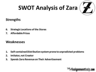 Zara was founded in 1975 by Amancio Ortega and targets young, fashion-conscious consumers without defining specific age groups. It offers the latest fashion trends through a fast fashion model with excellent communication between designers and consumers. Zara uses innovative manufacturing and logistics to rapidly design, produce, and distribute new items to stores weekly from Spain. This strategy of quick inventory turnover and frequent store visits has made Zara successful through brand awareness, attractive retail stores, and a focus on customer satisfaction over traditional advertising.