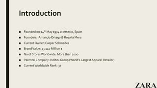 Zara was founded in Spain in 1974 and has grown to become the largest fashion retailer in the world. It aims to satisfy customers' desires through continuous innovation and providing new, quality designs at affordable prices. Zara uses a fast fashion model to quickly design and produce trendy clothing that is sold at relatively low prices. It focuses on young customers seeking on-trend styles and has over 1000 stores globally located in major cities.