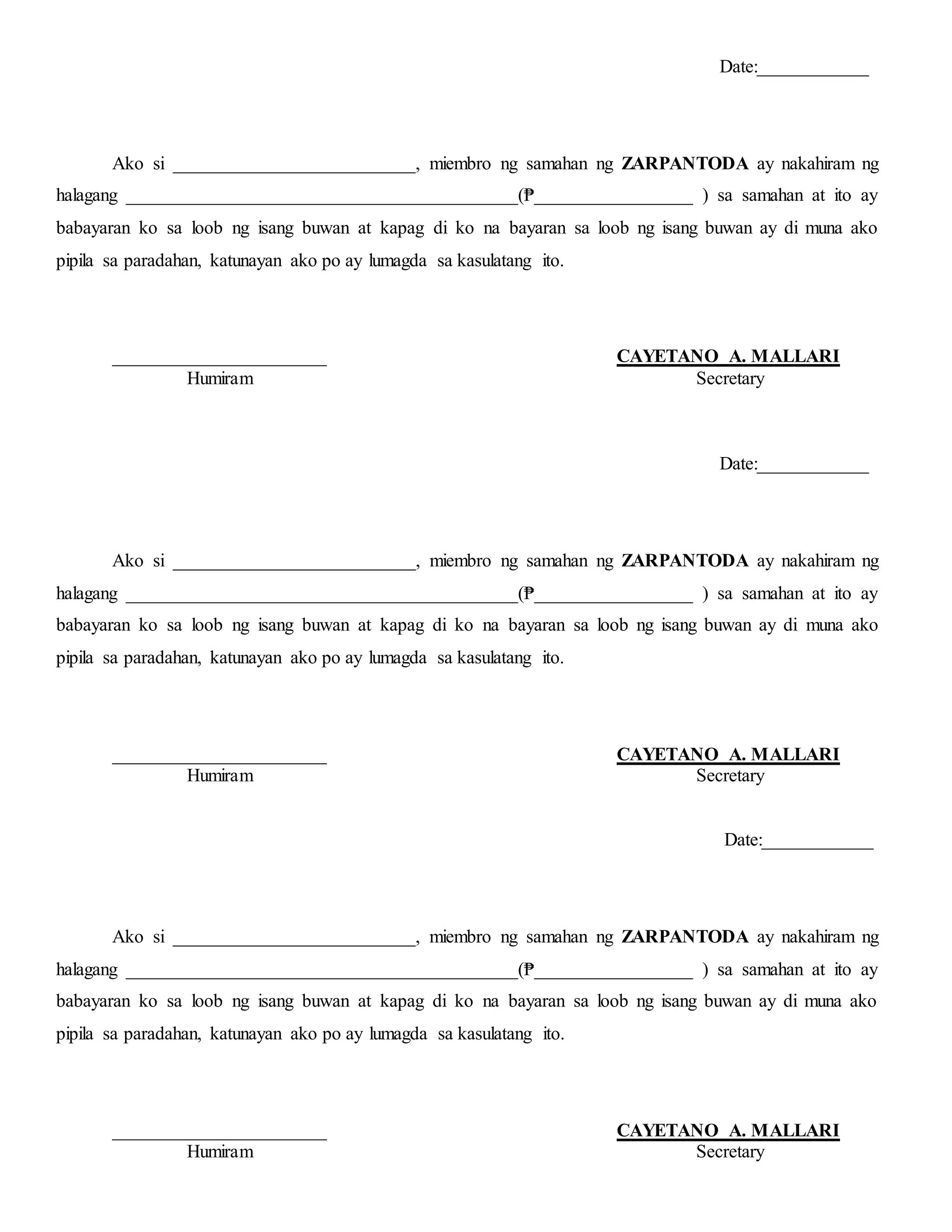 Ang dokumento ay isang kasunduan ng mga miyembro ng samahan ng zarpantoda na humiram ng halagang pera at obligadong bayaran ito sa loob ng isang buwan. Kung hindi sila makababayad sa itinakdang panahon, hindi na sila papayagang dumaan sa paradahan. Ang bawat kasunduan ay may lagda bilang patunay ng paghiram.