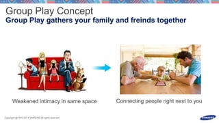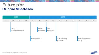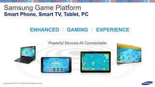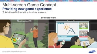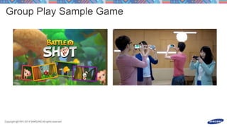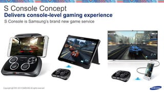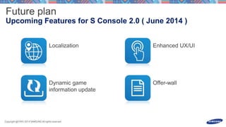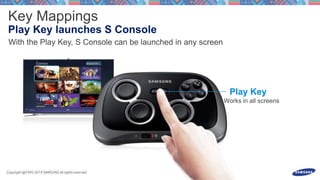 This document discusses launching an S Console game and processing input events from a gamepad or touchscreen motions. It includes code snippets for overriding methods to handle key events from a gamepad for buttons and directions as well as motion events to process touchscreen swipes and gestures above thresholds. The document also provides contact information for the Samsung game platform and a Facebook page for ongoing communication.