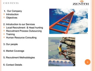 Zenith Management Consultancies is a full-service human resources solutions provider offering recruitment, training, and HR consulting services. It recruits personnel across various functions and industries. Its services include local recruitment, recruitment process outsourcing, in-house training programs, and consulting services focused on managing high potentials and organizational development. The company aims to be a strategic partner for its clients by developing talent and providing ongoing HR support and advice.