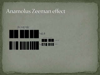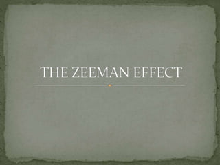 The Zeeman effect is the splitting of a spectral line into multiple spectral lines when in the presence of a magnetic field. It was first observed in 1896 by Dutch physicist Pieter Zeeman when he placed a sodium flame between magnetic poles and observed the broadening of spectral lines. Zeeman's discovery earned him the 1902 Nobel Prize in Physics. The pattern and amount of splitting provides information about the strength and presence of the magnetic field.