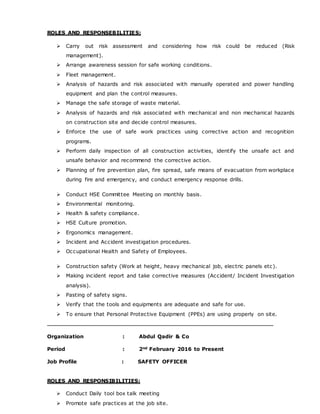 Zeeshan Ali Raza is a health and safety officer seeking a job in a challenging company. He has a B.S. in Geophysics and several international health and safety certificates. He has over 3 years of experience as an HSE officer and safety officer, where he conducted risk assessments, safety inspections, emergency response planning, and safety training. He is proficient in Microsoft Office and has strong communication, problem-solving, and safety promotion skills.