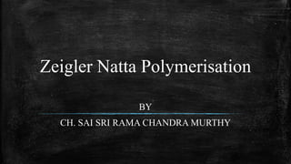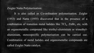 Ziegler-Natta polymerization is a coordination polymerization method discovered by Ziegler and Natta that requires a catalyst formed from transition metal halides and organometallic compounds. The process involves three steps: initiation, propagation, and termination, resulting in the production of various polymers such as polyethylene and polypropylene. However, it cannot be used to generate polyvinyl chloride or acrylates.