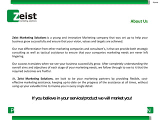 Zeist Marketing Solutions provides strategic and tactical marketing support for small and medium-sized businesses. Their services include branding, promotion, graphic design, marketing strategy development, and campaign management. They aim to become clients' full marketing department by handling all marketing needs and freeing up clients' time to focus on sales. By outsourcing marketing to Zeist, clients can reduce costs and increase productivity.