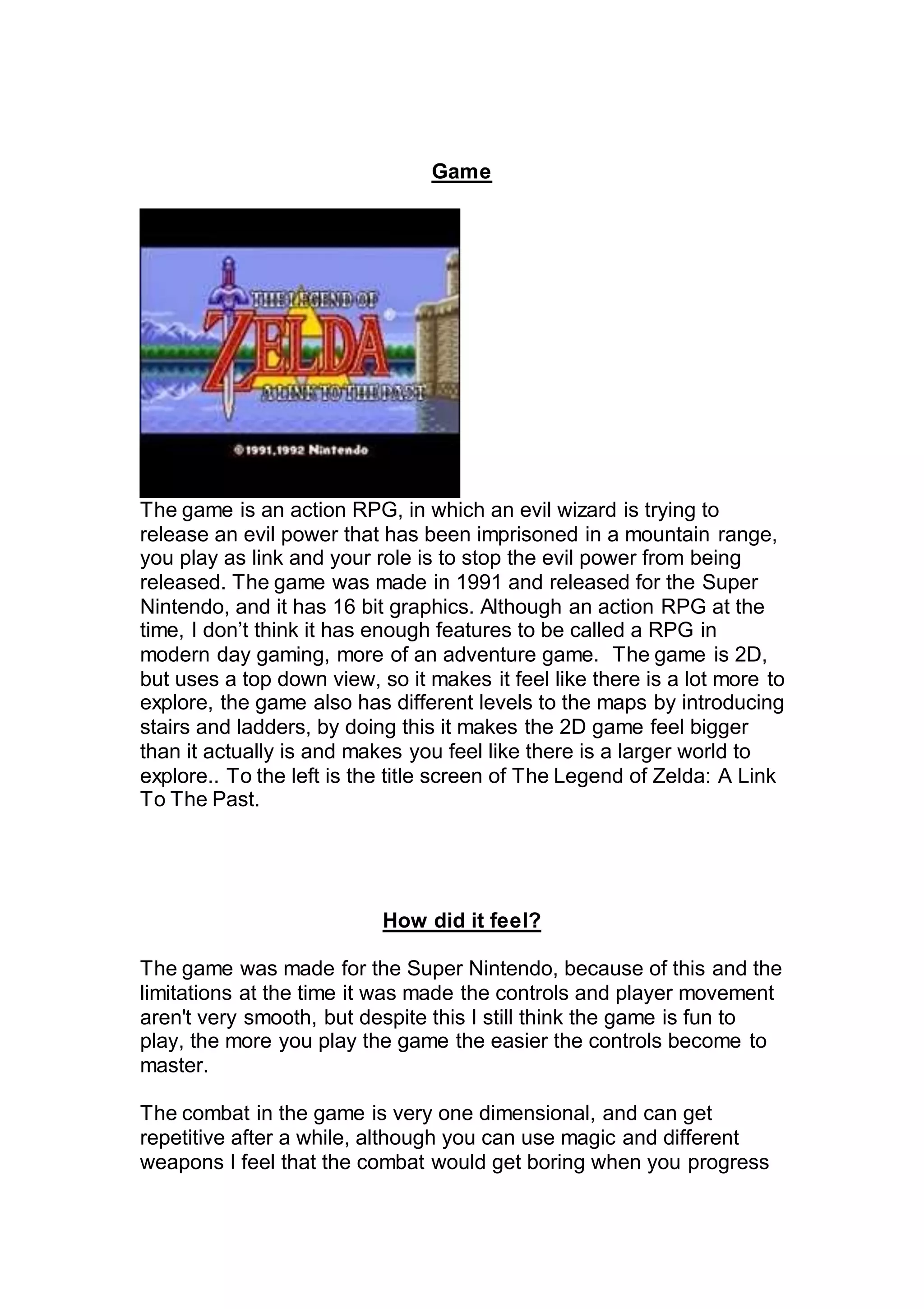 The document discusses The Legend of Zelda: A Link to the Past video game released for the Super Nintendo in 1991. It provides details on the game's story, gameplay, controls, combat, graphics, music and reception. The game is an action-adventure RPG where Link adventures through different maps and levels to rescue the descendants of the Seven Sages and save Princess Zelda from the evil wizard Ganon. While the controls and combat are basic by modern standards, most felt the game was fun and entertaining, with graphics and music that matched the 16-bit era well. However, more core gamers may find it boring compared to later RPGs with more in-depth systems.