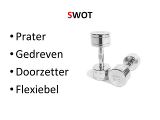 The document discusses strengths, weaknesses, opportunities, and threats for someone in new media. It lists attributes like driven, flexible, and cooperative as strengths, while also mentioning old media, stress, and cynicism as threats. The document seems to be a SWOT analysis for someone considering a career in new media.