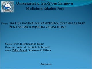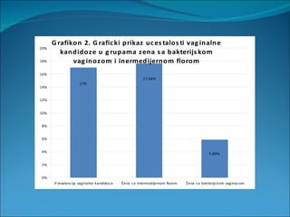 This document discusses a study examining the relationship between bacterial vaginosis and vaginal candidiasis in women. The study analyzed vaginal samples from 100 women over six months, diagnosing both conditions. The results showed that vaginal candidiasis was more common in women without bacterial vaginosis, suggesting the bacterial imbalance in bacterial vaginosis may protect against candidiasis. In other words, vaginal candidiasis was less frequent in women with bacterial vaginosis compared to women with normal vaginal flora.