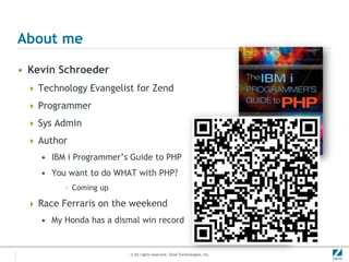 This document summarizes Kevin Schroeder's presentation on Zend Server. It discusses Zend Server's features like monitoring, code tracing, job queuing, and session clustering that help manage and scale PHP applications. It also promotes attending ZendCon to learn best practices for PHP development, deployment, and use of Zend technologies like Zend Framework and Zend Server. The presentation concludes by emphasizing the benefits of using Zend Server's code tracing feature in production environments to help identify issues.